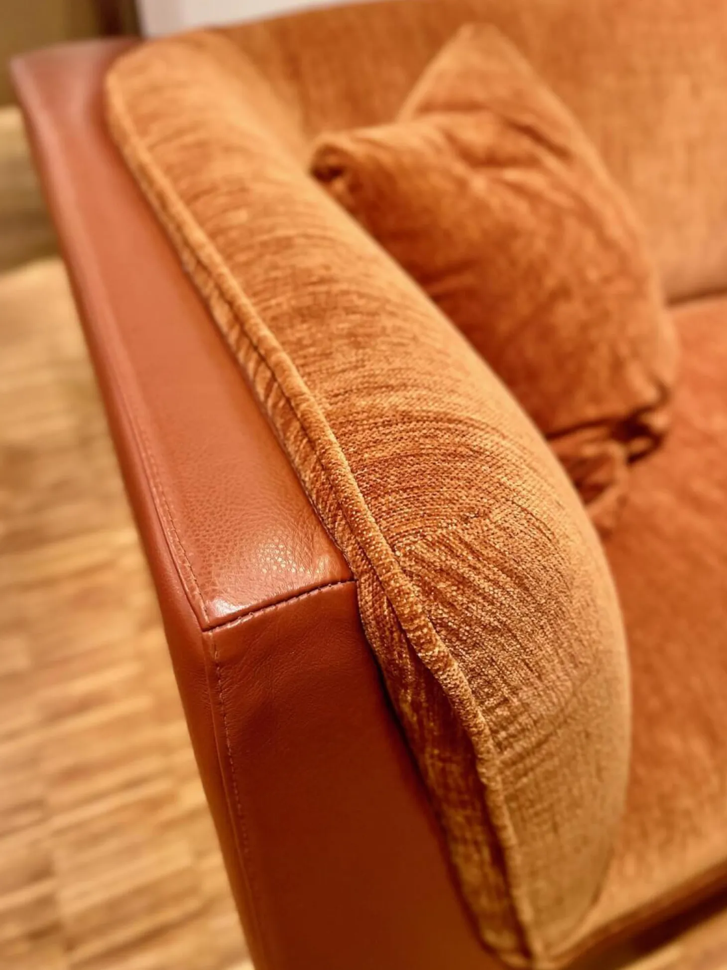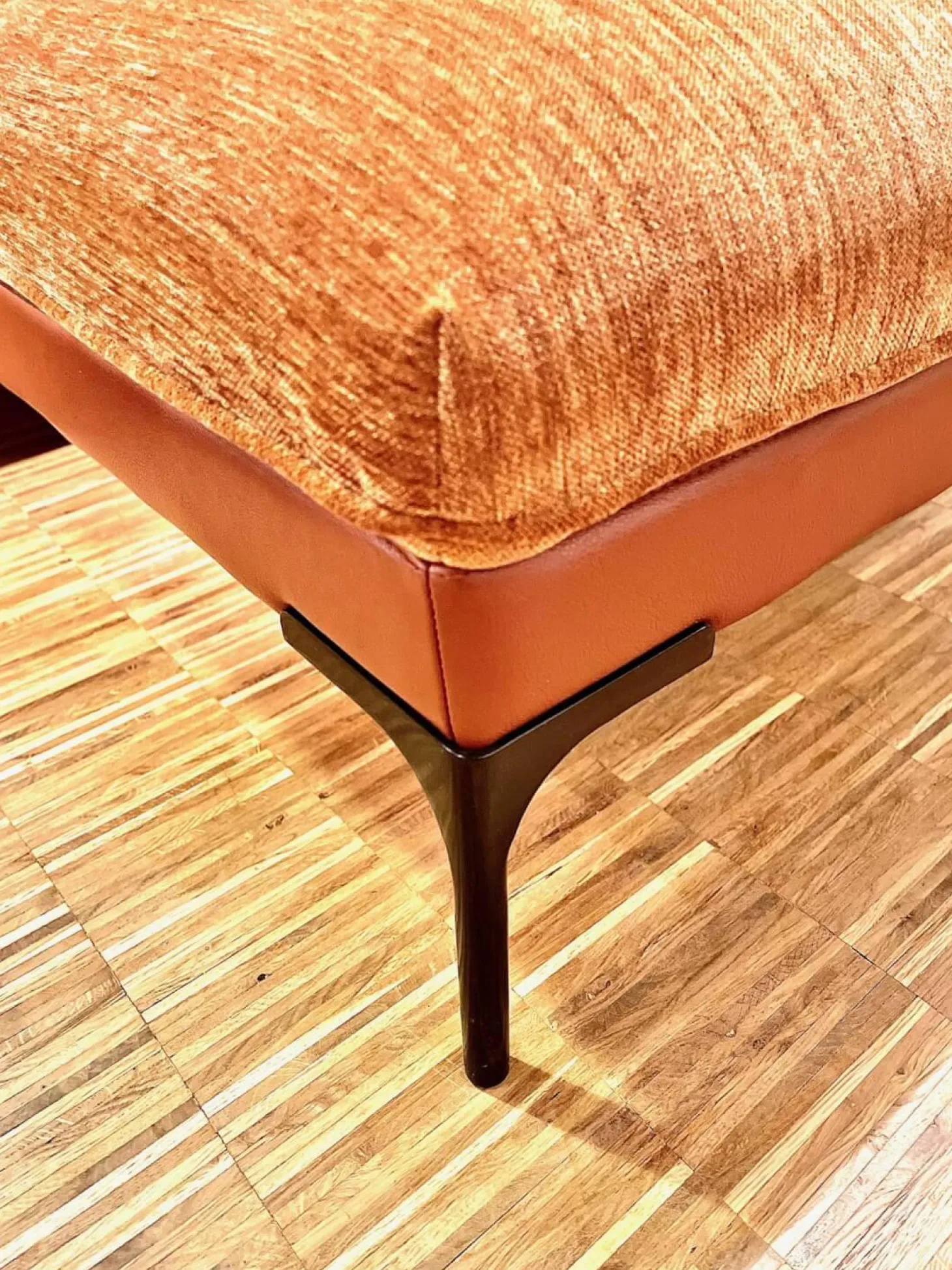 Ecksofa Frej Stoff Chenille Und Echtleder Cognac Orange Braun Winkelfüße Metall Schwarz
