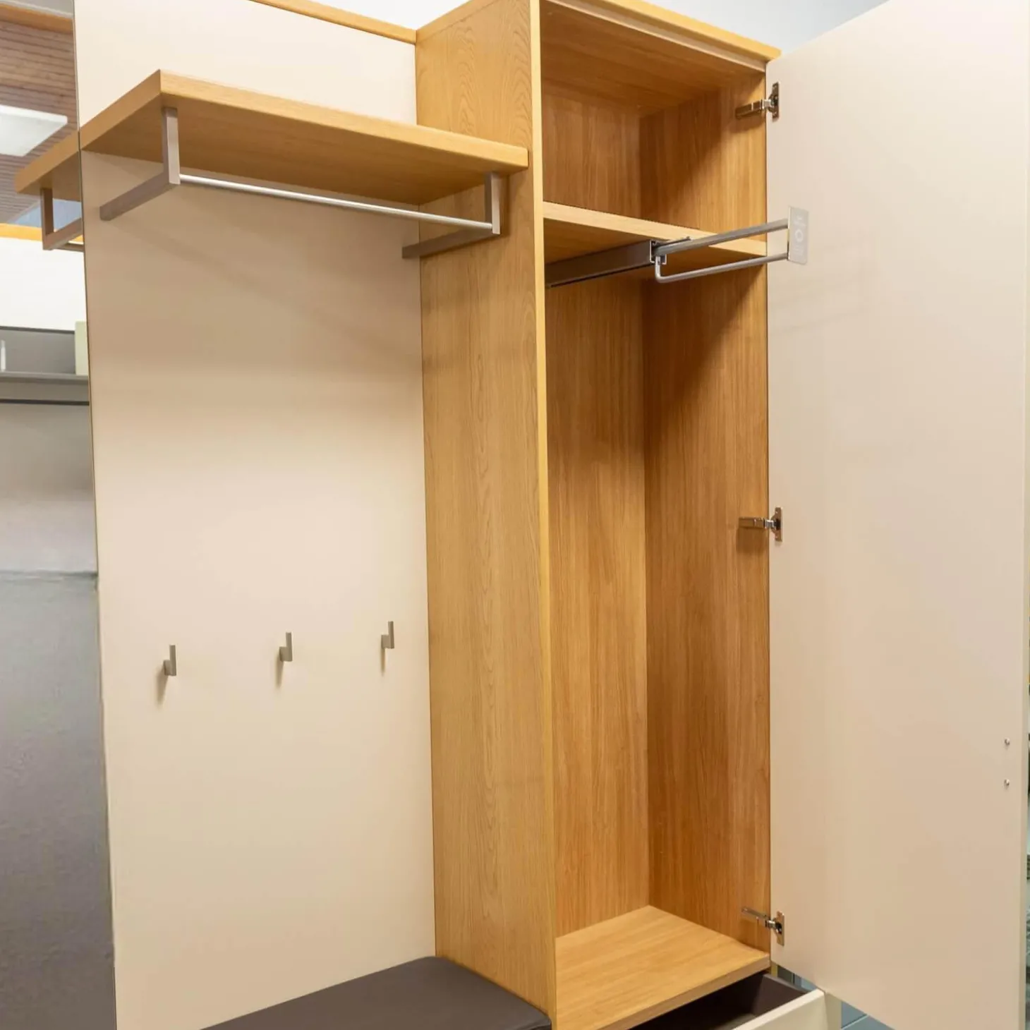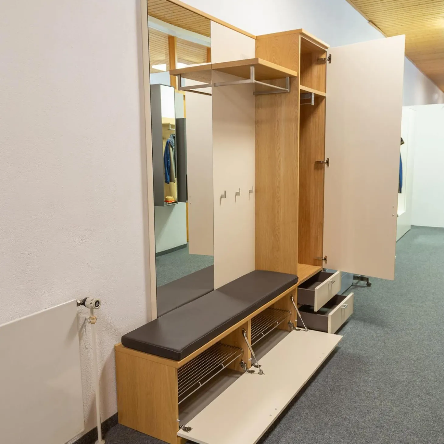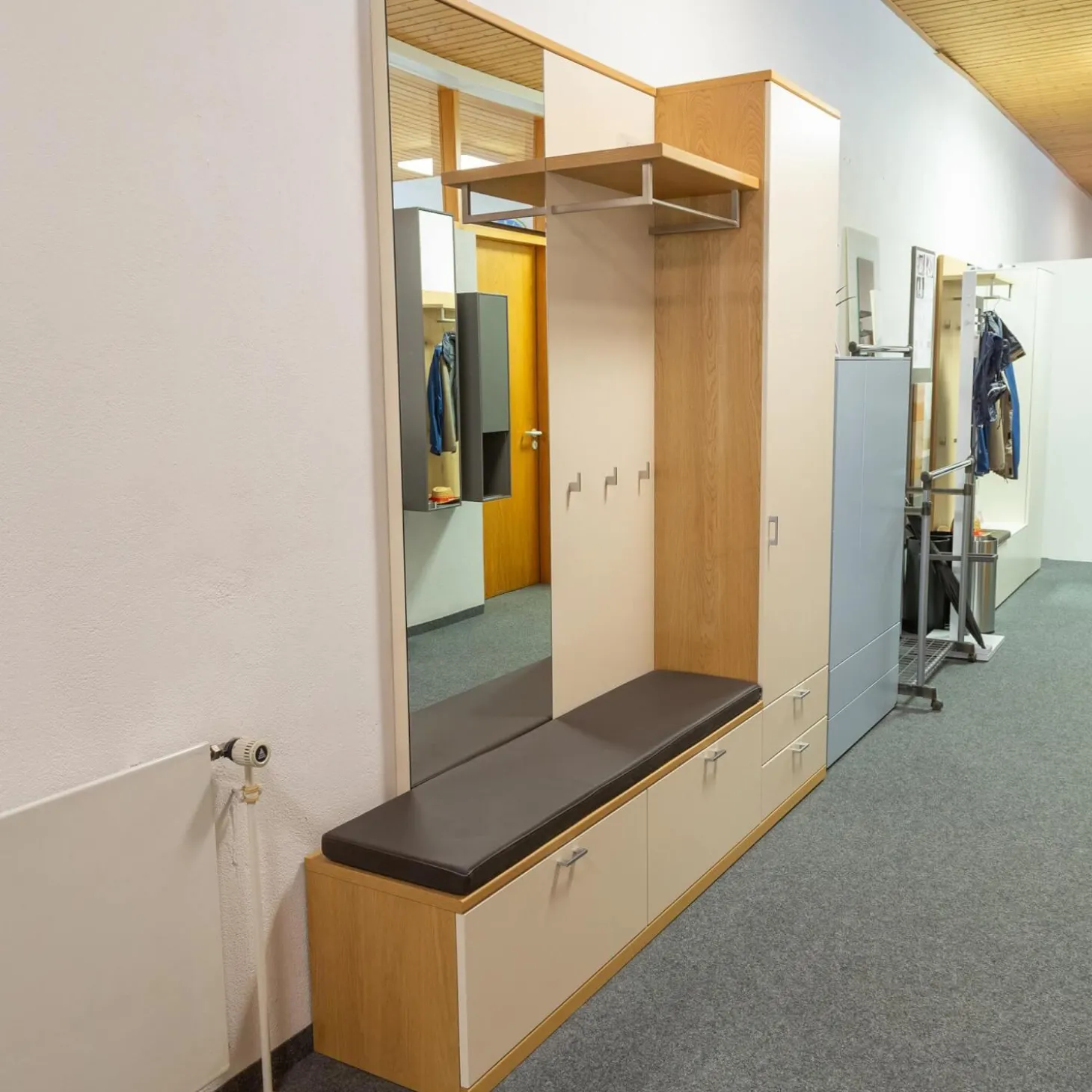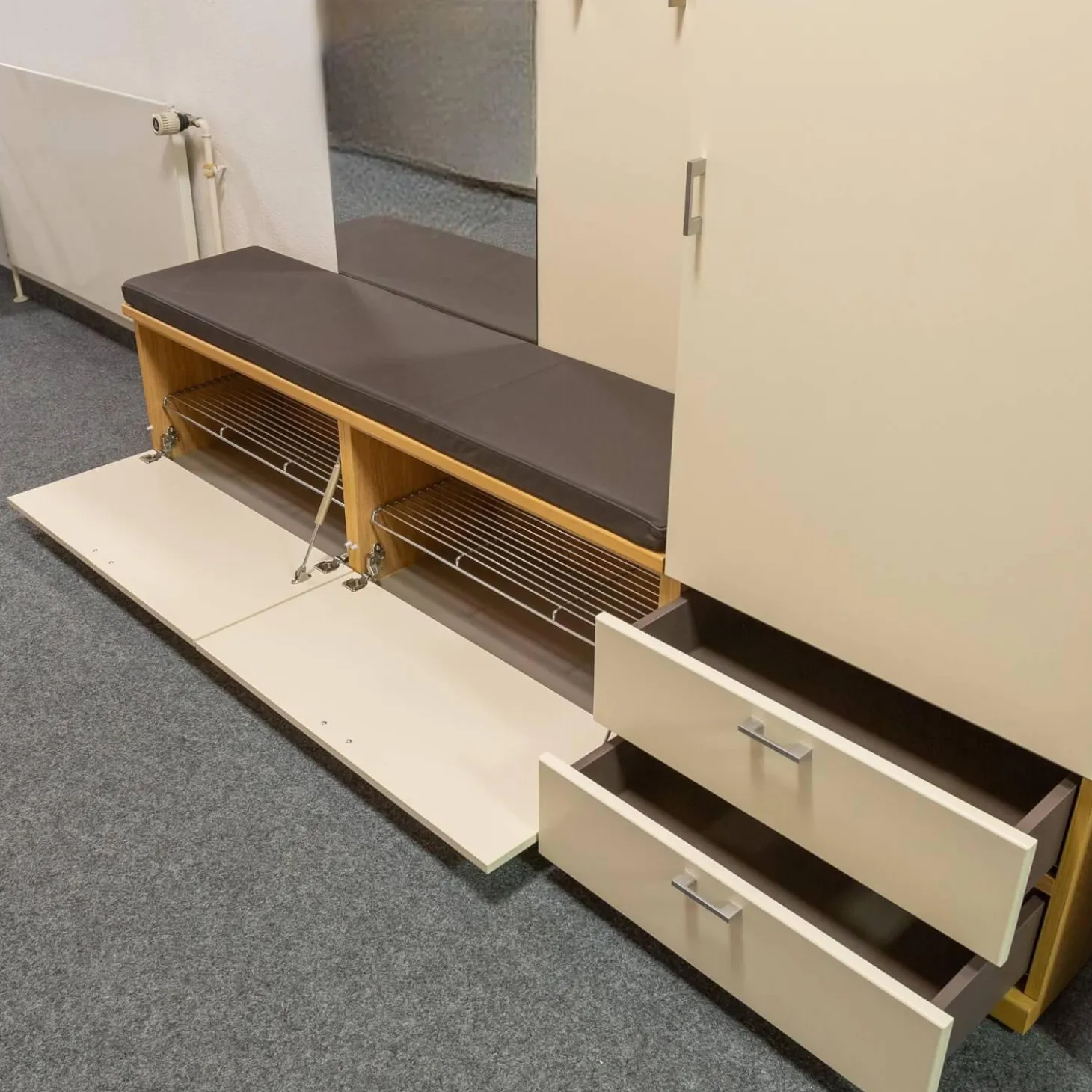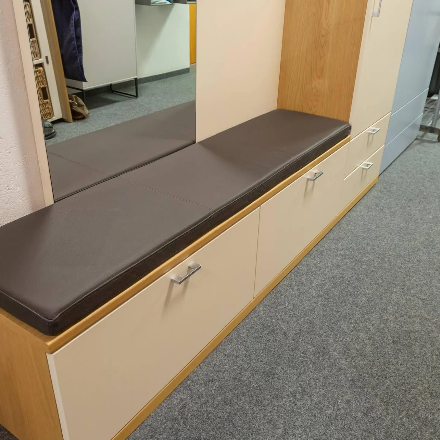 Breite: Gesamt: 210 Bank: 42.3 Spiegelpaneel: 60 Garderobenpaneel: 60 Schrank: 60 Sitzkissen: 150 cm