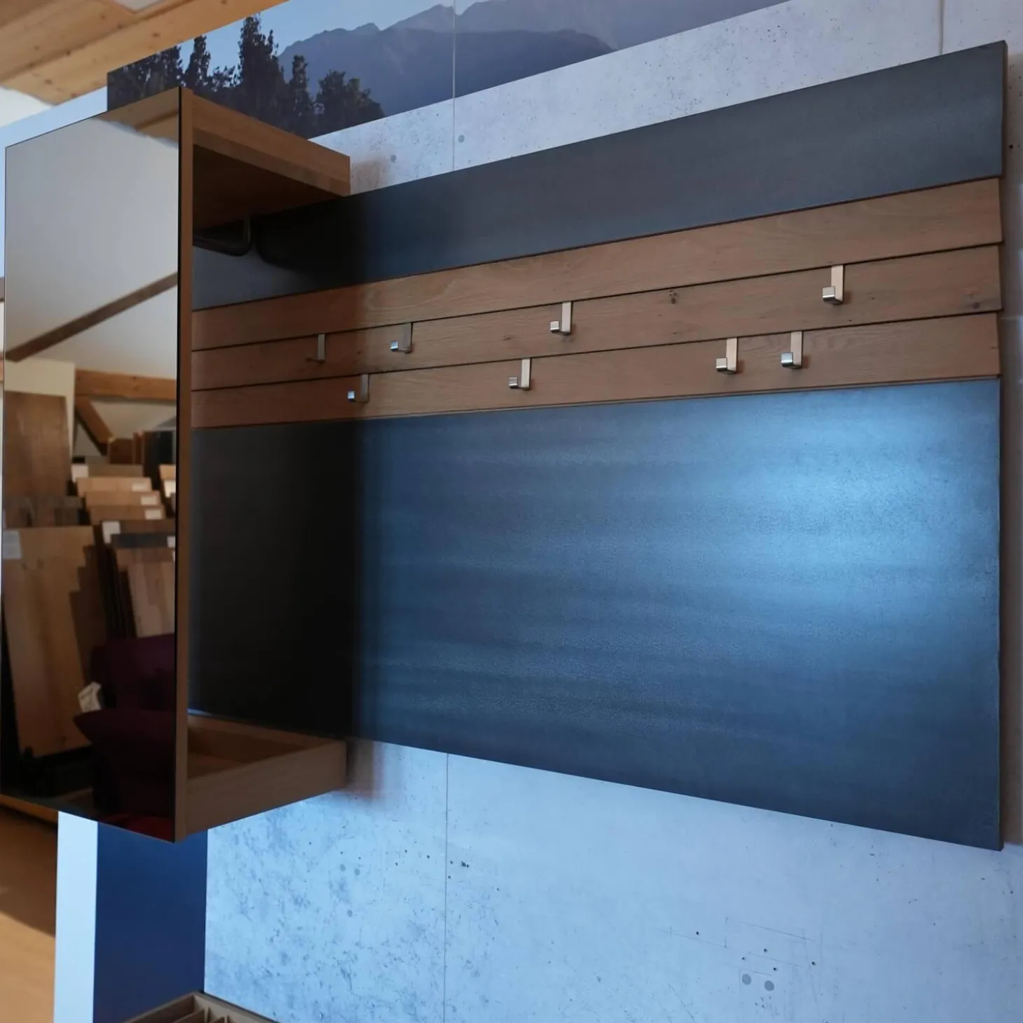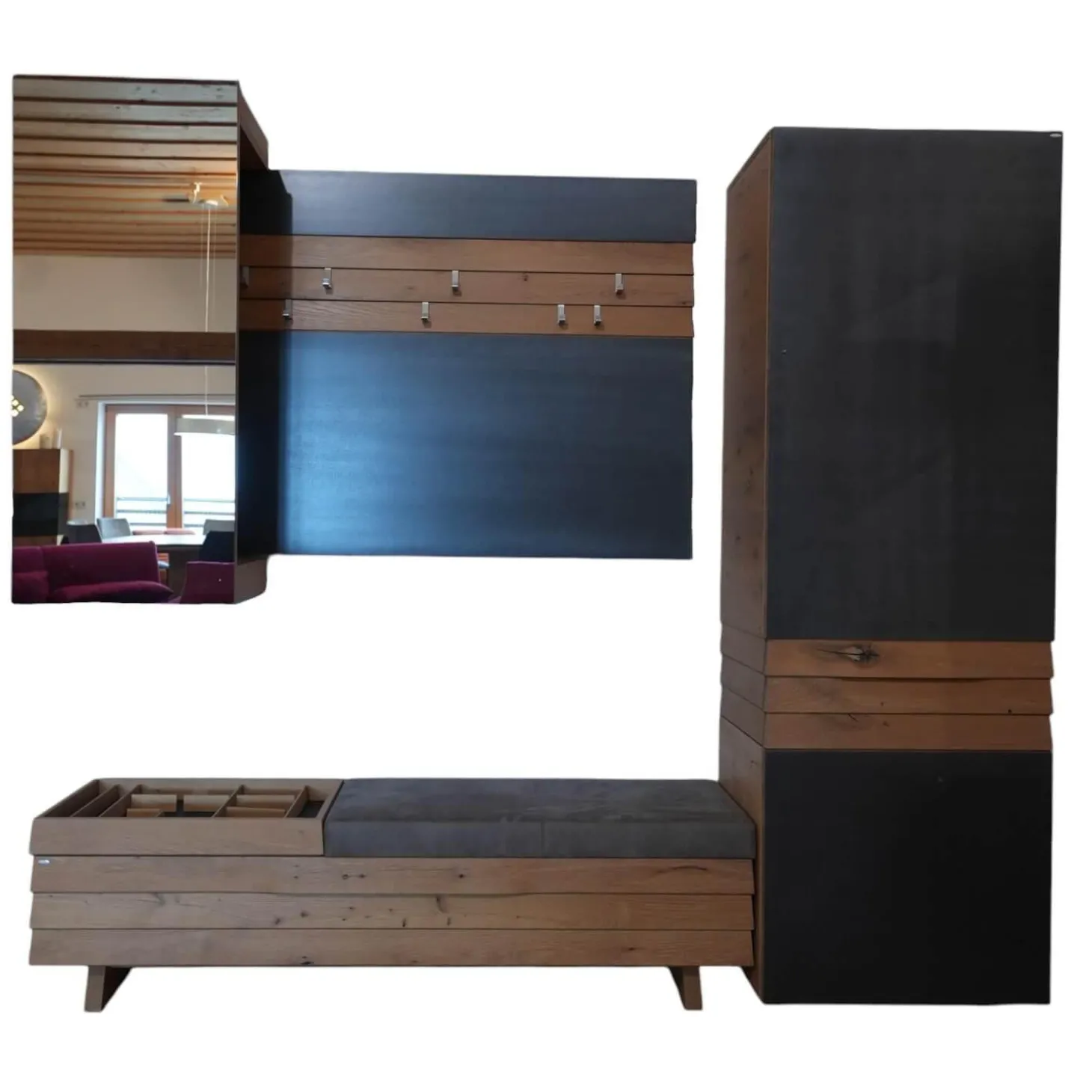 Lieferumfang: 1 Wandgarderobe bestehen aus 1x Dielenschrank, 1x Garderobe mit Vorsatzspiegel, 1x Bank Ohne Haken und Utensilienablage