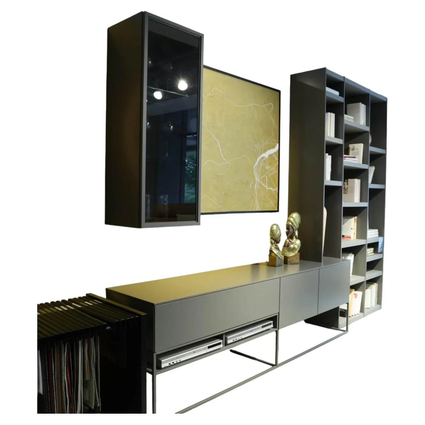 Lieferumfang: Wohnwand bestehend aus: 1 Lowboard, 1 Regalwand, 1 Hängeelement, ohne Dekorationen