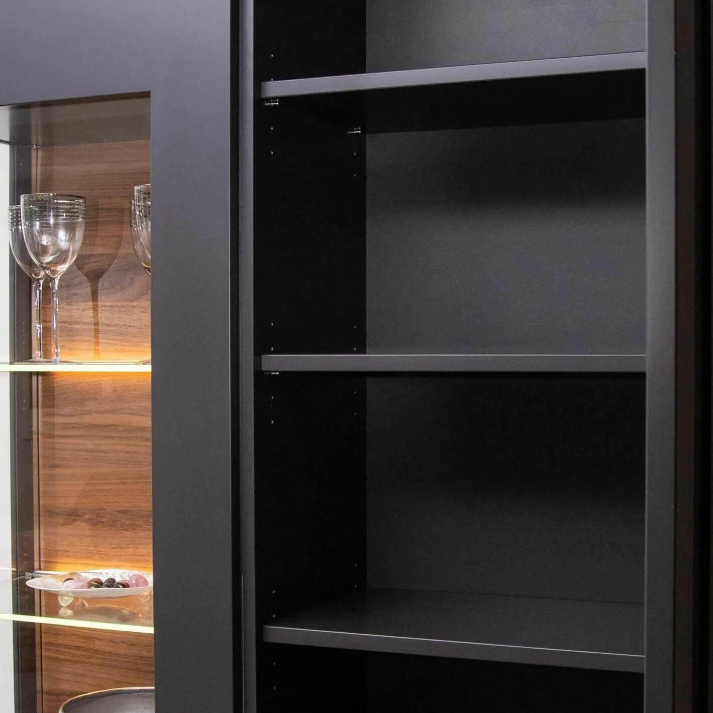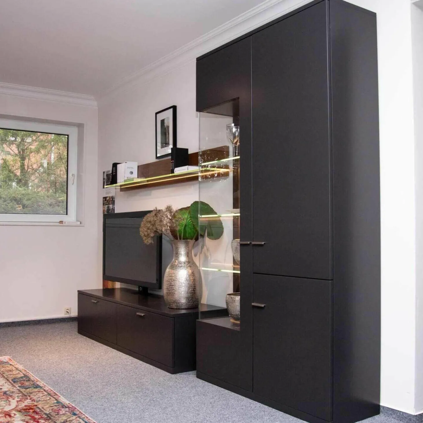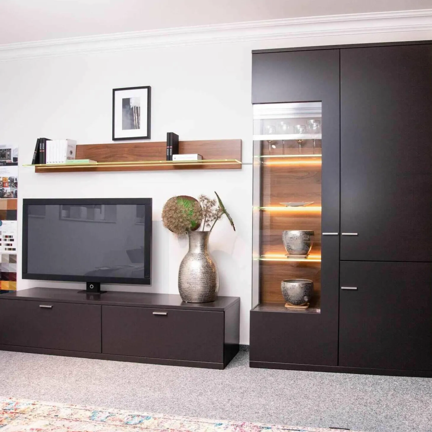 Tiefe: Regal: 18, TV-Sideboard: 50, Vitrinenschrank: 120 cm