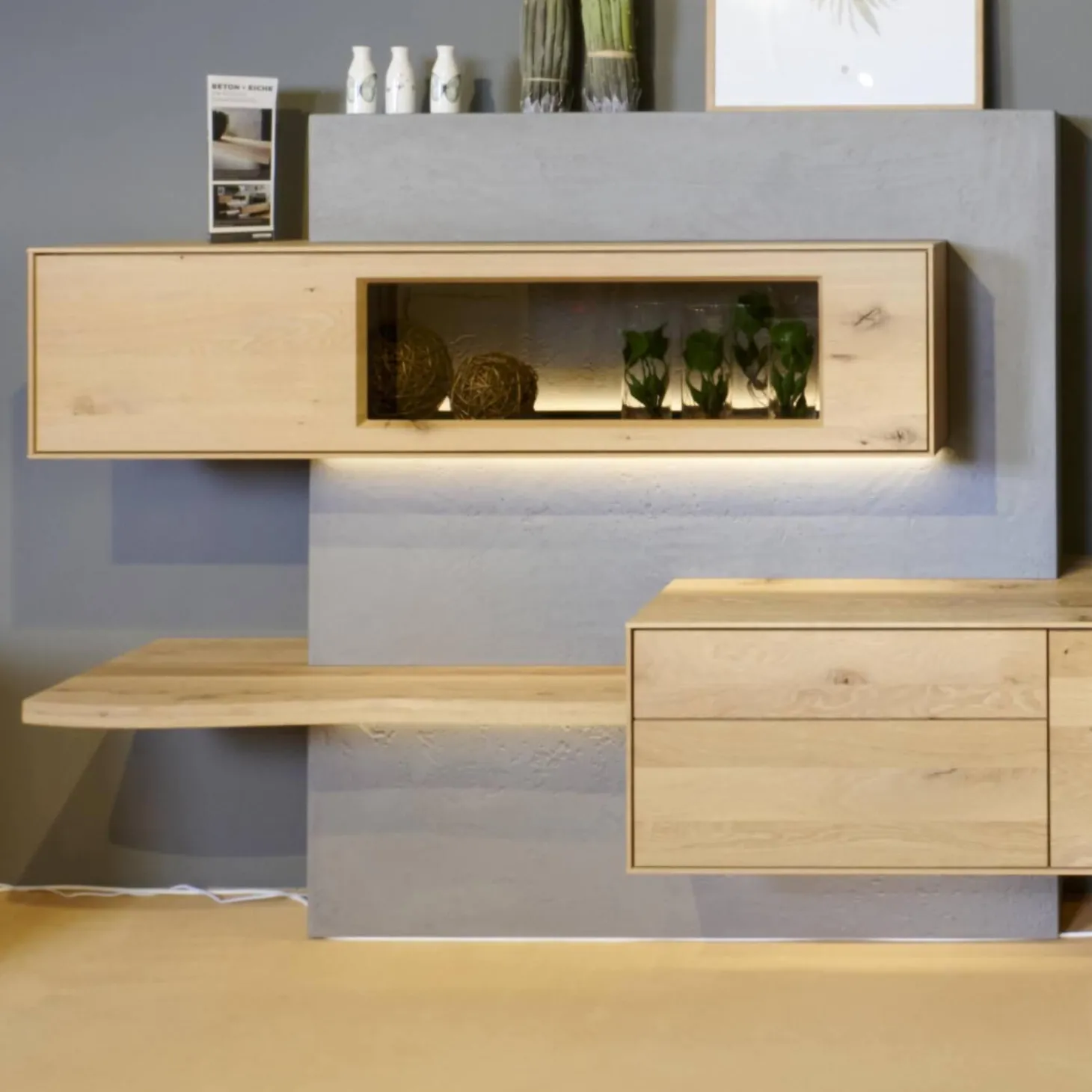 Lieferumfang: 1 Wohnwand bestehend aus:1 Betonbaustein, 1 Hängevitrine, 1 Hängelowboard, 2 Wandleuchten
