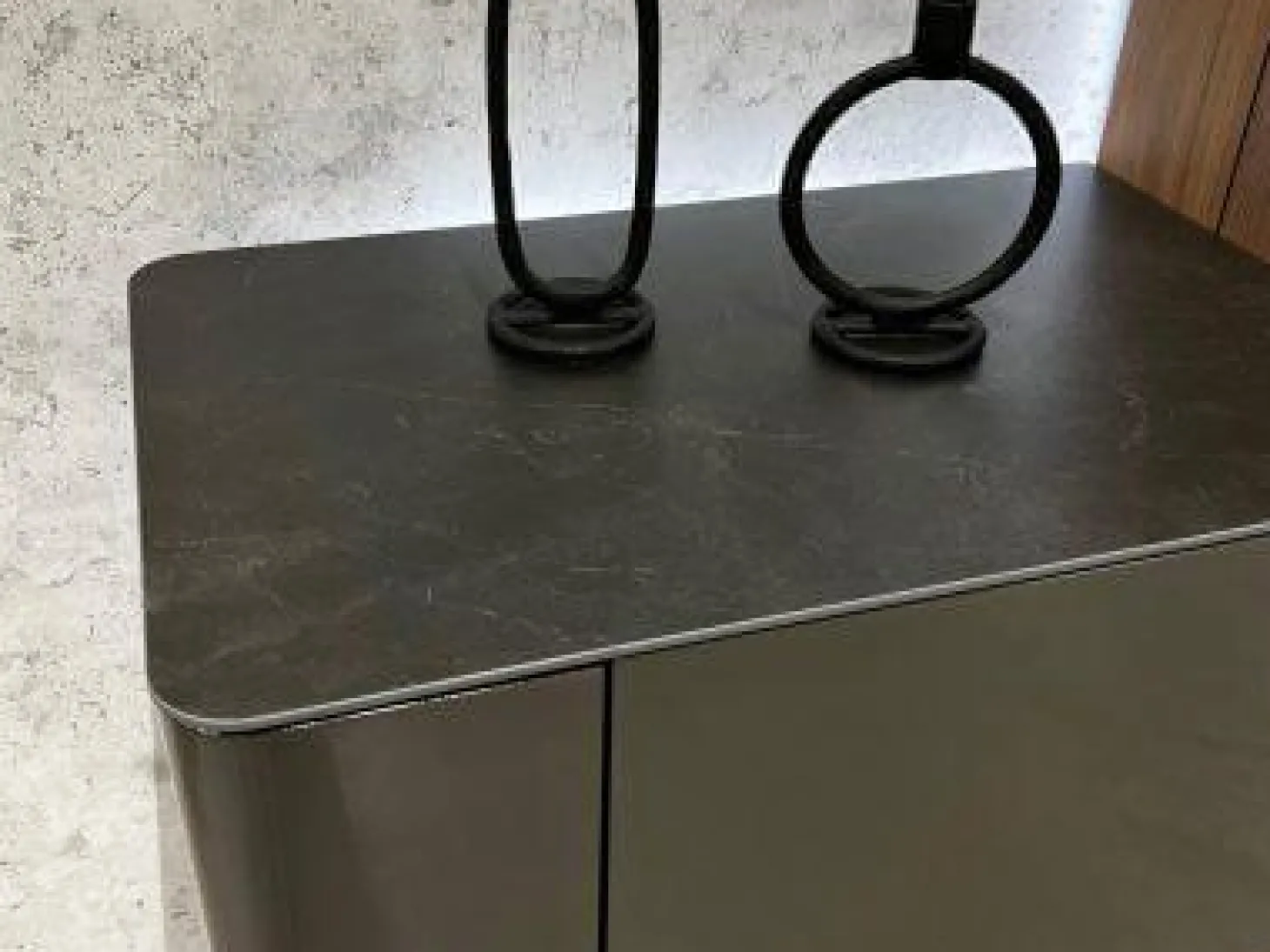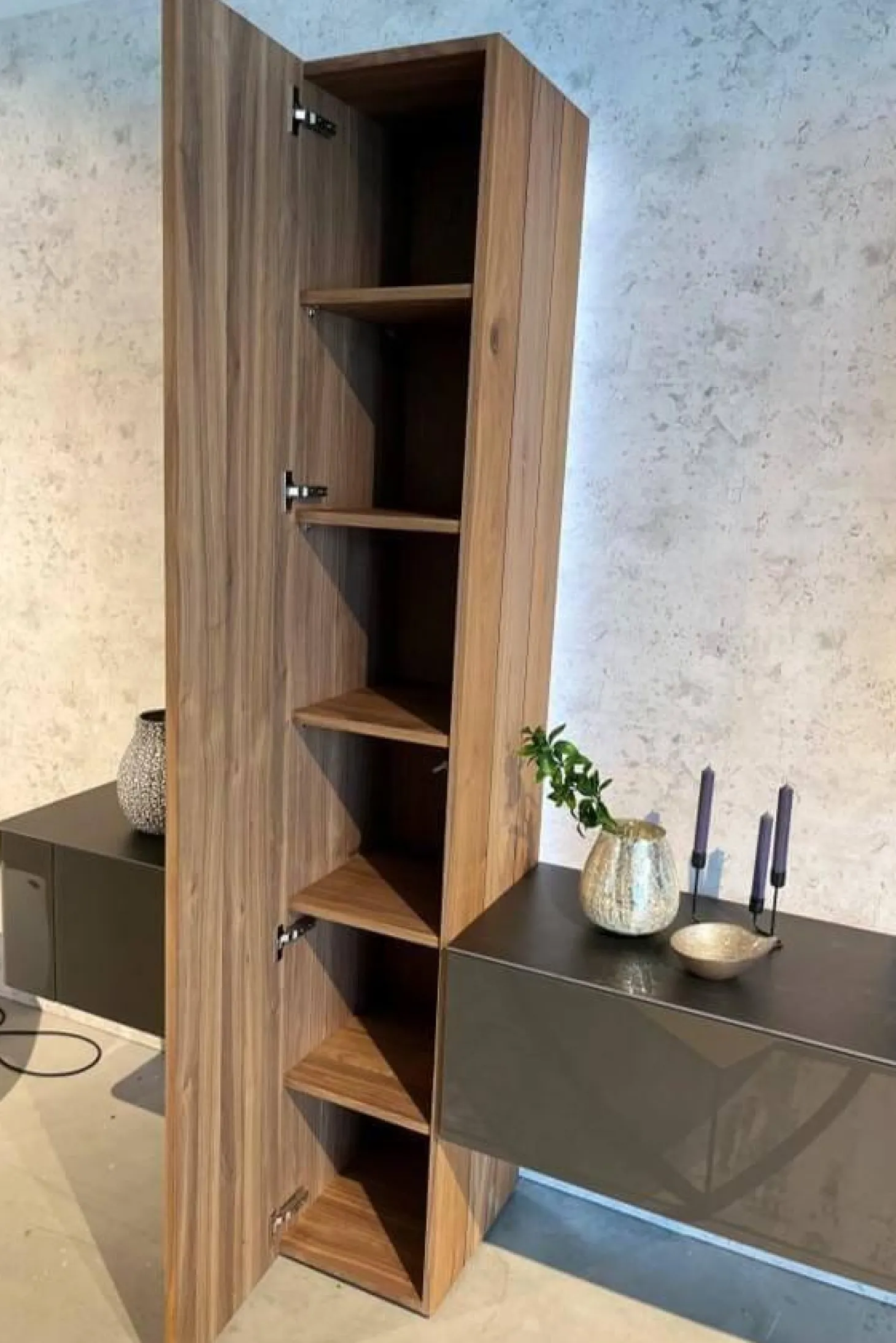 Farbbezeichnung des Herstellers: Lack HGL-seidengrau, Keramik Storm nero, Kernnussbaum Naturstamm, NCS S4010-Y30R