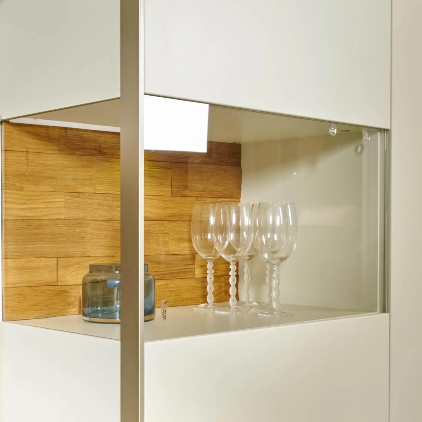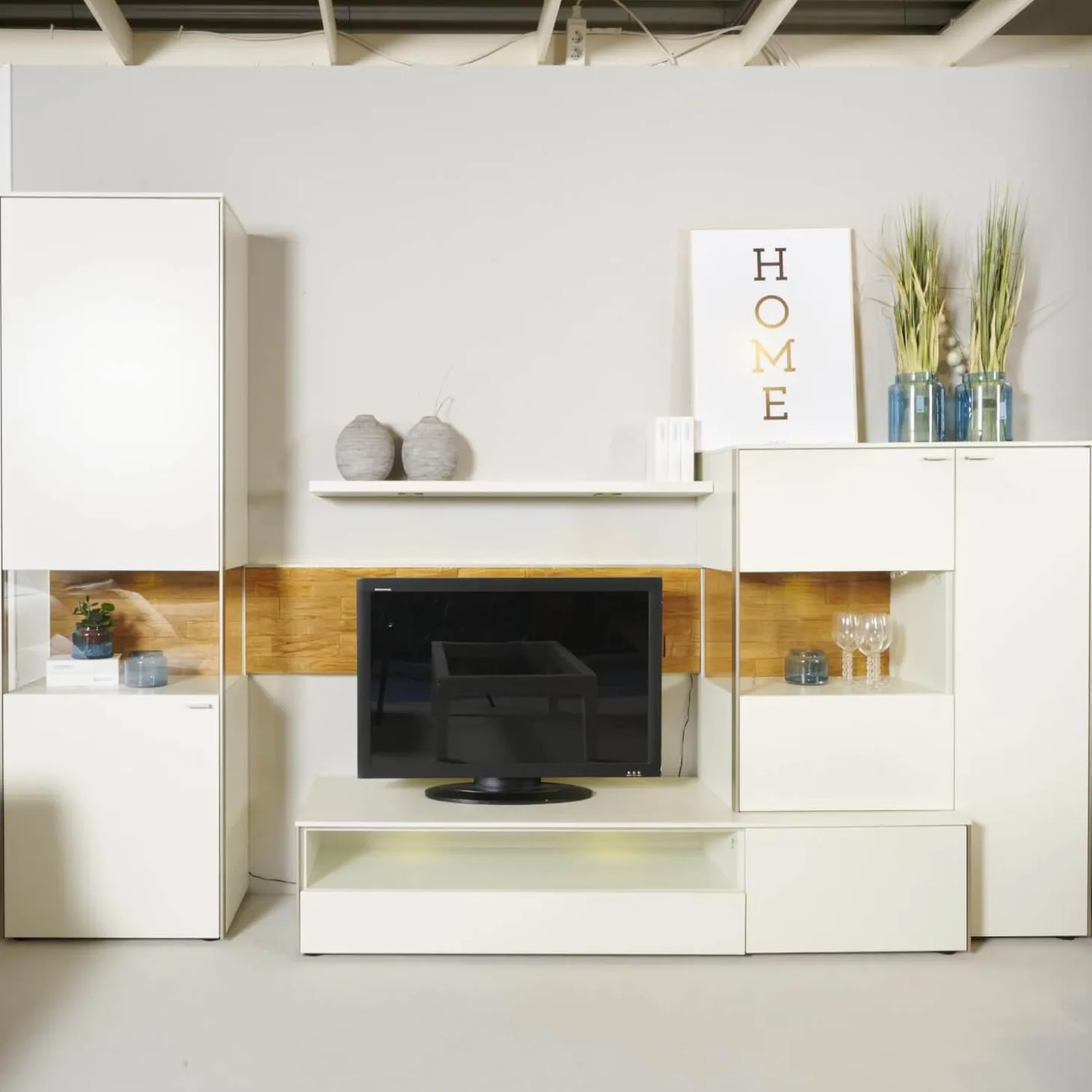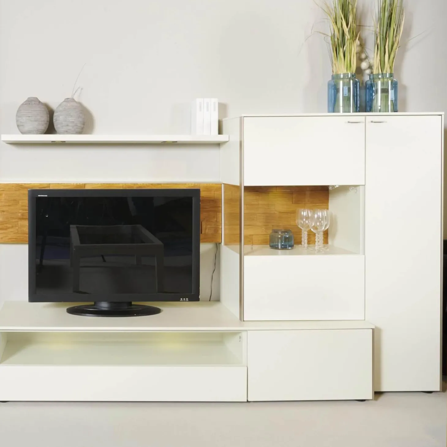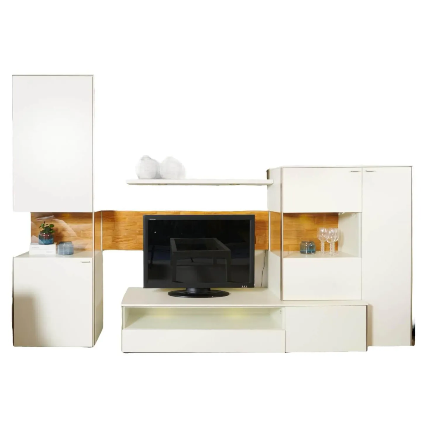 Lieferumfang: 1 Wohnwand bestehend aus:2 Vitrinen, 1 Lowboard, 1 Wandbord
